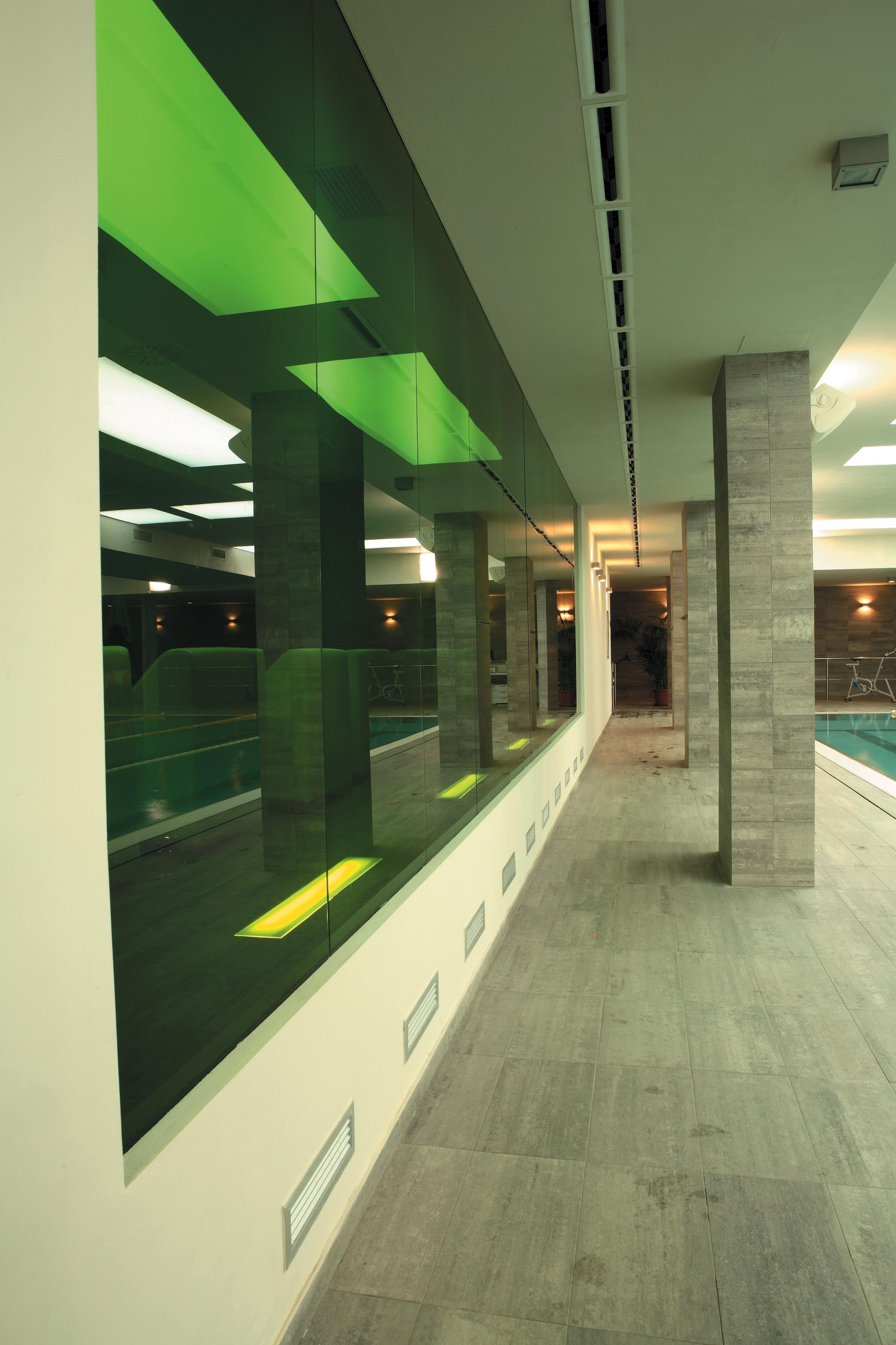 Il progetto definisce uno spazio austero e di grande atmosfera, costruito con equilibrio e razionalità, dove l’impianto geometrico della composizione assume un valore di stabilità visiva, coniugando i temi della leggibilità con quelli della variazione luministica. Il ruolo funzionale delle superfici ceramiche, sapientemente accostate al bianco degli intonaci, viene brillantemente risolto attraverso l’impiego di un solo materiale, semplicemente declinato in due eleganti tonalità di grigio, con finitura naturale e bocciardata in funzione all’impiego. Il rivestimento risale dal piano fondale della piscina verso la fasciatura parietale fissando con esattezza i limiti spaziali; mentre il candore del soffitto, enfatizzato dalla luce zenitale, diventa lo schermo che riflette e amplifica il colore dell’acqua reso in toni grigio-verdi dal materiale dell’interno vasca.
